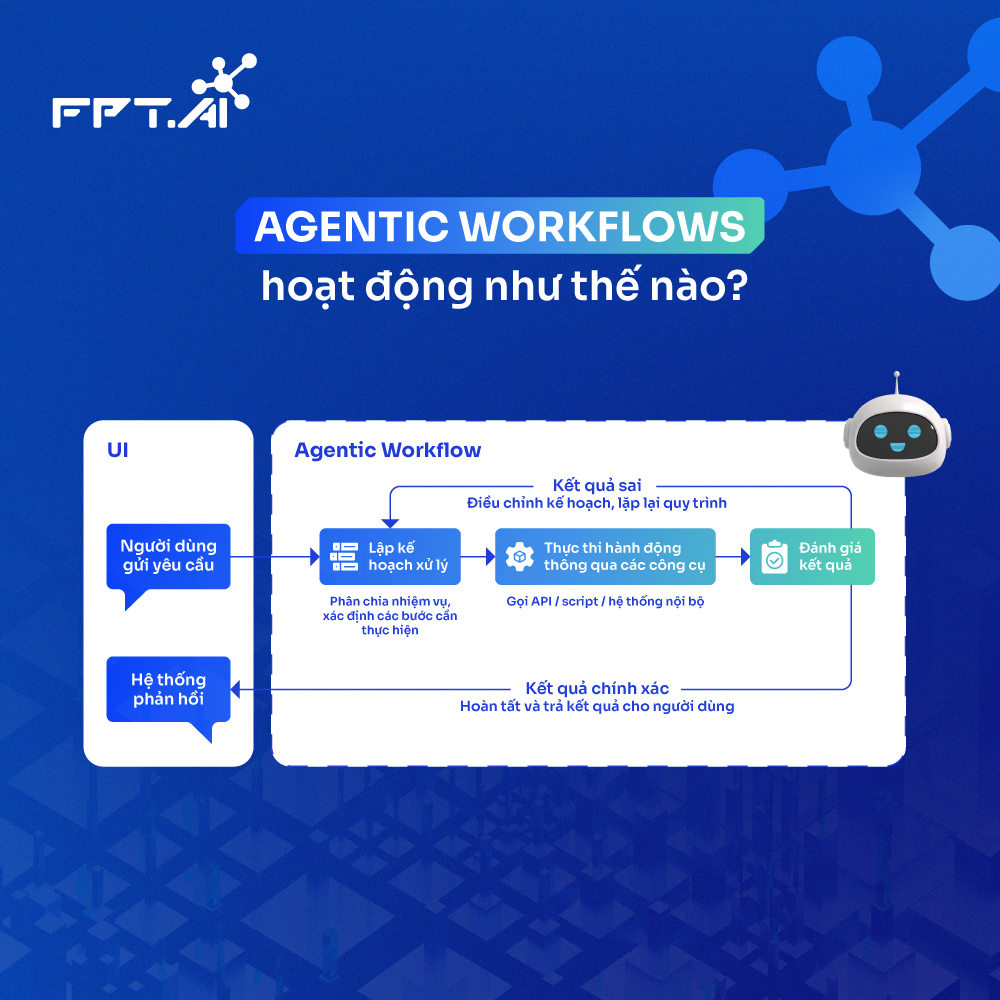 Khi tự động hóa quy trình truyền thống dần chạm ngưỡng giới hạn bởi các kịch bản cứng nhắc và luật định sẵn, agentic workflows xuất hiện như một bước tiến mới trong cách doanh nghiệp vận hành với AI. Không chỉ “làm theo lệnh”, các AI Agent trong agentic workflows có khả năng hiểu ngữ cảnh, tự lập kế hoạch, ra quyết định và điều chỉnh hành động theo diễn biến thực tế của vấn đề.