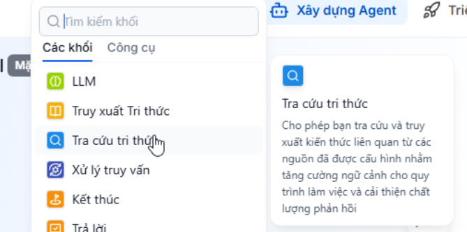 Khác với khối “Truy xuất tri thức” là khối tự động tìm nội dung liên quan dựa trên mức độ tương đồng của dữ liệu, khối “Tra cứu tri thức” hoạt động theo cách lọc trực tiếp: chỉ lấy những tri thức đáp ứng đúng các điều kiện đã cấu hình, không thực hiện so sánh mức độ liên quan.