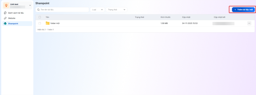 Bên cạnh hai nguồn tài liệu hiện tại là Tri thức từ tài liệu tải lên kho tri thức và Tri thức đồng bộ về từ website, hệ thống hỗ trợ thêm tính năng tích hợp nguồn dữ liệu từ SharePoint.Tính năng này giúp mở rộng và đa dạng hóa nguồn dữ liệu, cho phép đồng bộ và khai thác dữ liệu nội bộ một cách linh hoạt, đồng thời giảm thiểu thao tác thủ công trong quá trình làm việc