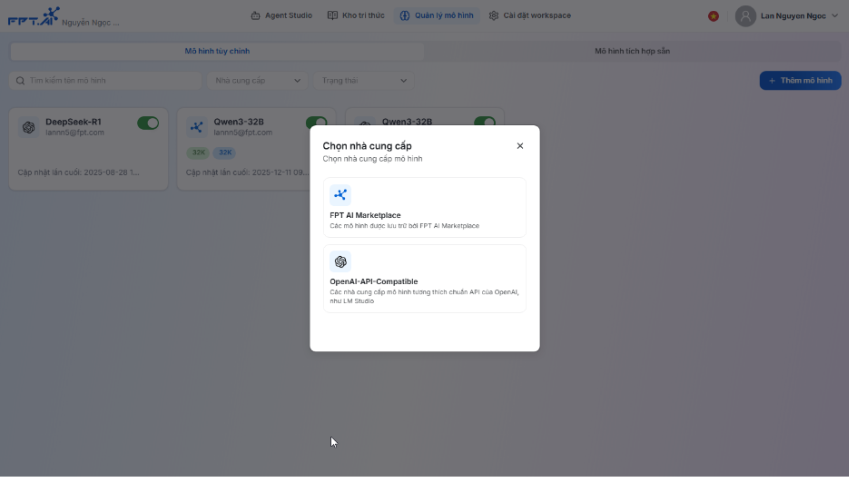 Quản lý mô hình Tính năng Quản lý mô hình cho phép người dùng trên nền tảng AI Agents dễ dàng cấu hình và bổ sung các mô hình ngôn ngữ lớn (sau đây gọi là LLM) khác, bên cạnh những mô hình mặc định có sẵn trong hệ thống. Chức năng này giúp: