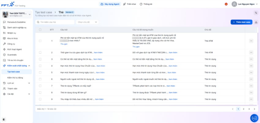 Tính năng Tạo testcase tự động cho phép người dùng nhanh chóng sinh ra bộ testcase chất lượng cao từ tài liệu trong kho tri thức. Bộ testcase này được dùng để kiểm thử khả năng phản hồi của AI Agent dựa trên nhiều loại nghiệp vụ khác nhau (trích xuất, tóm tắt, so sánh, tổng hợp, suy luận). Chức năng này giúp: Tự động hóa quá trình tạo testcase, tiết kiệm thời gian cho QC/Tester. Đảm bảo bộ kiểm thử đa dạng, bám sát tài liệu nguồn. Theo dõi tiến trình sinh testcase và kết quả kiểm thử trực tiếp trên hệ thống. Xuất dữ liệu testcase để tái sử dụng.
