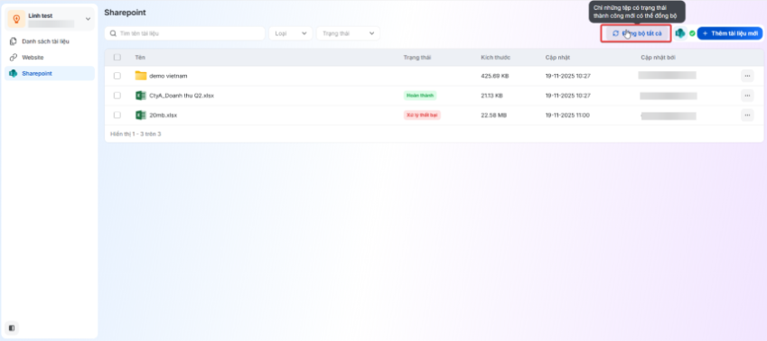 Đối với các tệp đã được thêm vào AI Agent thông qua SharePoint, khi nội dung trên SharePoint được cập nhật, người dùng có thể sử dụng tính năng Đồng bộ để làm mới dữ liệu. Tính năng này giúp đảm bảo nội dung giữa SharePoint và AI Agent luôn khớp nhau, đồng bộ hóa thay đổi một cách nhanh chóng và chính xác, hạn chế sai lệch trong quá trình làm việc. Khi đồng bộ một tệp, hệ thống kiểm tra xem tệp đó có đủ điều kiện đồng bộ không. Tệp trên SharePoint cần thỏa mãn các điều kiện sau: