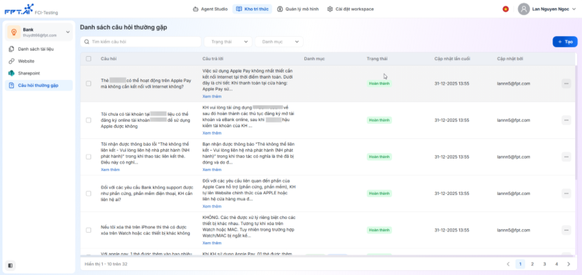 Tính năng Quản lý câu hỏi thường gặp (FAQs) cho phép quản trị viên tạo và quản lý tập trung các câu hỏi thường gặp (Question/Answer) để bổ sung tri thức cho Agent nhanh chóng. Thay vì phải ingest cả tài liệu theo luồng xử lý tài liệu thông thường, tính năng giúp cập nhật từng câu hỏi và câu trả lời, dễ kiểm soát, xử lý nhanh chóng và chính xác, phù hợp cho các tình huống cần tra cứu nhanh.
