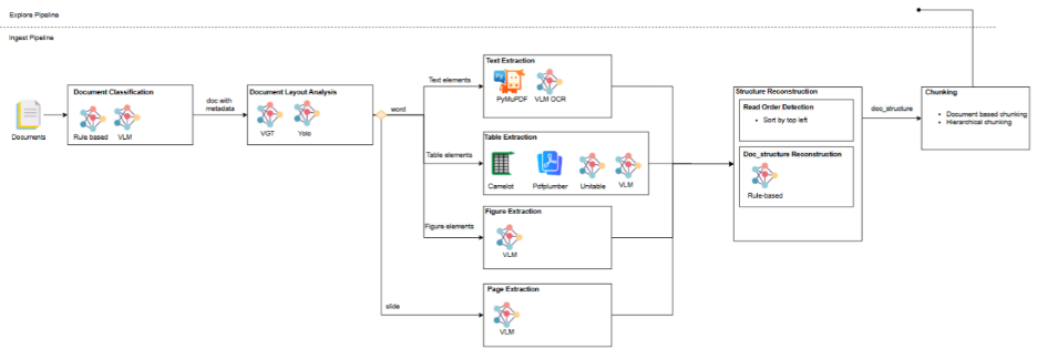 Như trong sơ đồ trên, DLA là bước phân tích cấu trúc tài liệu nhằm xác định các elements trên từng trang (text, title, table, figure, header, footer, list-item, …). Khi tài liệu được ingest vào hệ thống, DLA chạy tự động và trả về danh sách các elements cùng vị trí tương ứng của chúng trên tài liệu.