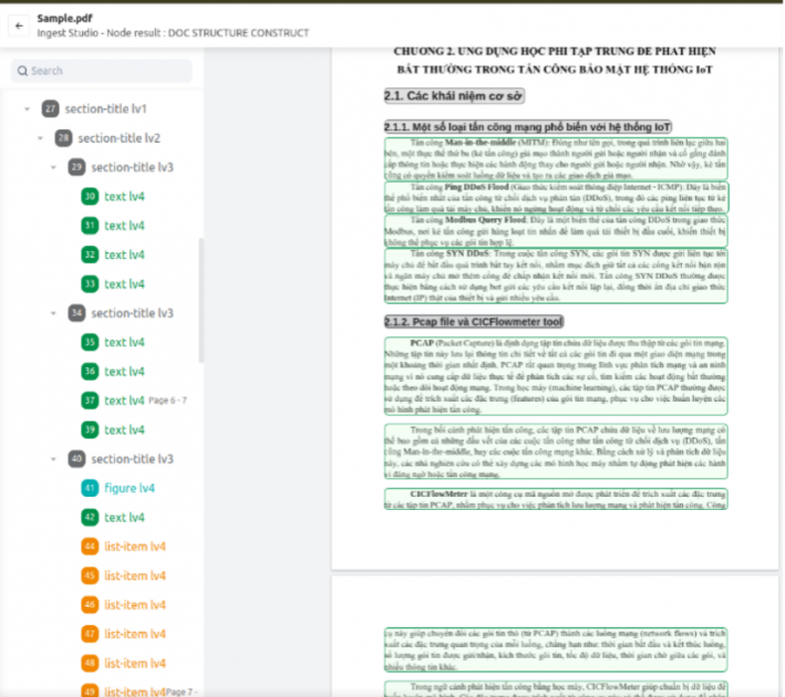 - Xem chi tiết kết quả xử lý của bước DLA: hiển thị cấu trúc bố cục tài liệu đã được hệ thống phân tích (bao gồm elements và các thông tin đi kèm của elements)