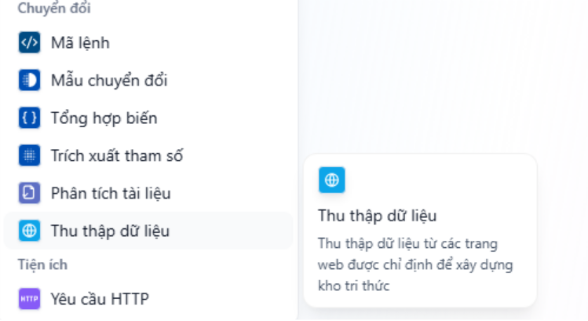 Trong quá trình tạo Nhiệm vụ, người dùng có thể cần thu thập dữ liệu từ các trang web để phục vụ cho việc phân tích thông tin, xây dựng báo cáo hoặc soạn thảo nội dung. Hệ thống hỗ trợ thao tác này thông qua hai thành phần chính: