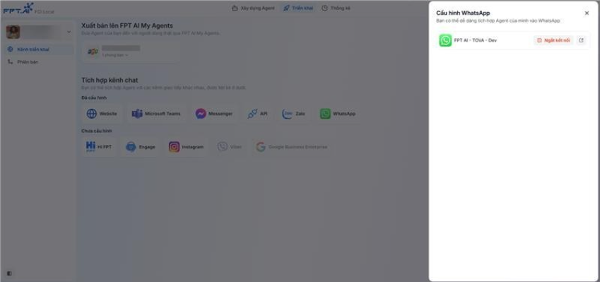 Sau khi hoàn thiện AI Agent, người dùng có thể muốn đưa Agent lên WhatsApp để phục vụ người dùng cuối. Để hỗ trợ nhu cầu này, hệ thống đã bổ sung tính năng tích hợp WhatsApp thông qua Meta Developer, giúp người dùng dễ dàng kết nối và triển khai AI Agent trên nền tảng WhatsApp