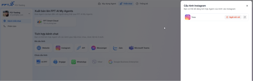 Sau khi hoàn thiện xây dựng AI Agent, người dùng có thể muốn đưa Agent lên Instagram DM để người dùng cuối có thể tương tác hỏi đáp với AI Agents trên đó. Để hỗ trợ nhu cầu này, hệ thống đã bổ sung tính năng tích hợp AI Agent với Instagram DM thông qua Meta Developer, giúp người dùng dễ dàng kết nối và triển khai AI Agent trên nền tảng Instagram DM.