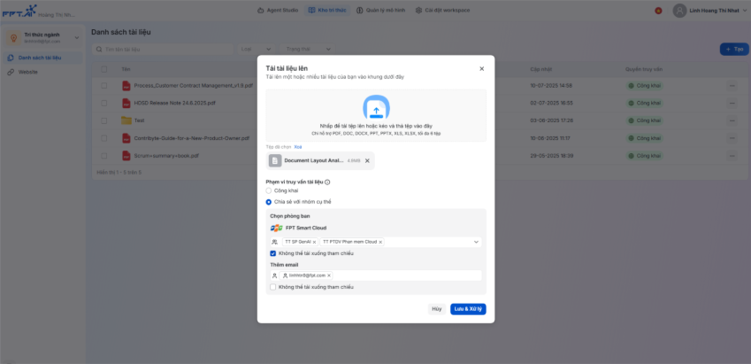 Tài khoản có định danh (người dùng đăng nhập bằng email hoặc tài khoản tổ chức trong FPT) → Hệ thống hiển thị thông tin được lấy từ: Các tài liệu công khai và các tài liệu đã được phân quyền truy cập cho tài khoản đó.
