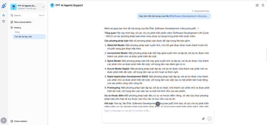 Ngoài ra, các tệp được tải lên trong quá trình trò chuyện với Agent cũng sẽ được tự động lưu vào My Storage, giúp người dùng dễ dàng quản lý và truy xuất khi cần. Sau khi tệp được tải lên My Storage và xử lý thành công, người dùng có thể dùng tệp đó trong quá trình trò truyện trên MyAgent bằng cách đề cập tới tên tệp (sử dụng cú pháp @ trong hộp chat) với mục đích cụ thể như tóm tắt, tổng hợp, hỏi đáp thông tin… với tài liệu riêng này.