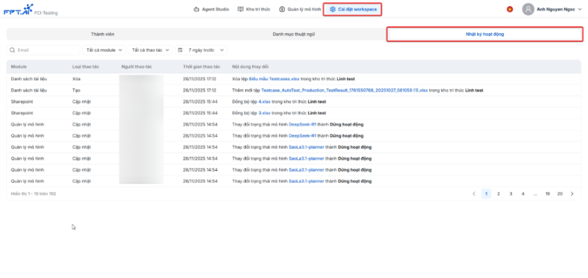 Trong một workspace, mọi thao tác quan trọng đều cần được ghi nhận để phục vụ việc theo dõi và tra cứu khi cần thiết. AI Agent cung cấp tính năng Nhật ký hoạt động (Audit Log), giúp Tenant Admin dễ dàng kiểm soát ai đã thực hiện thao tác gì, đồng thời hỗ trợ việc kiểm tra khi xảy ra sự cố hoặc cần rà soát lịch sử.