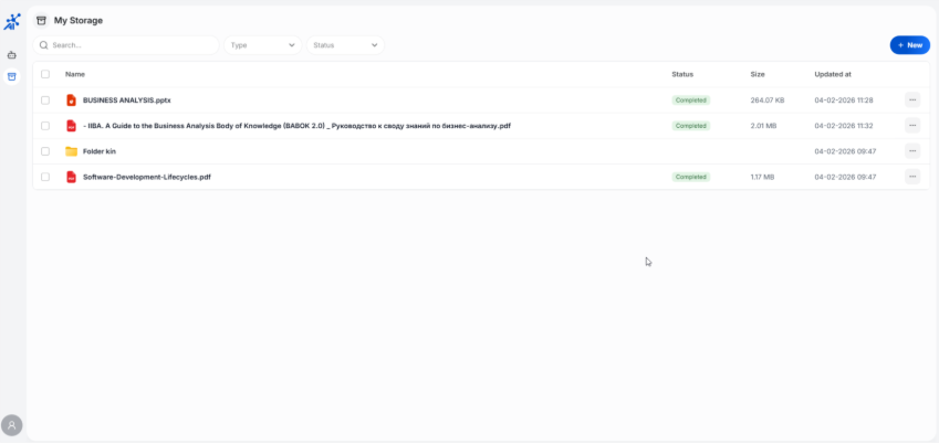 Ngoài khả năng cho phép người dùng có thể đính kèm file tài liệu cá nhân để sử dụng trong khi trò chuyện với AI Agent thì FPT AI MyAgents hỗ trợ cung cấp một kho lưu trữ dữ liệu riêng để giúp người dùng có thể tái sử dụng tài liệu khi khi làm việc với nhiều Agent khác nhau hoặc trong các cuộc hội thoại khác nhau. Tính năng My Storage cho phép người dùng tạo thư mục và tải lên tệp để quản lý tài liệu cá nhân. Khi một tệp được tải lên, hệ thống sẽ tự động xử lý (ingest) dữ liệu, giúp người dùng có thể tái sử dụng mà không cần xử lý lại, từ đó tiết kiệm thời gian.