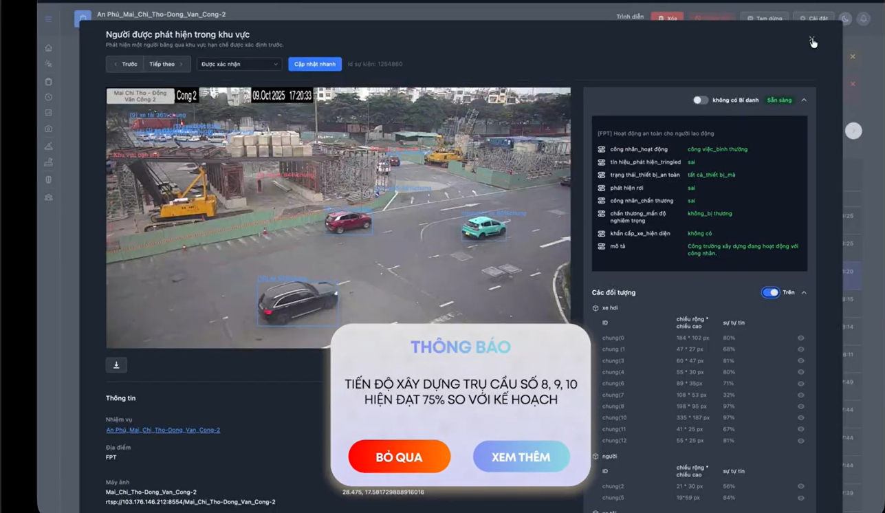 Một trong những sáng kiến tiêu biểu chính là Hệ thống phân tích dữ liệu hình ảnh với AI được Trung tâm Chuyển đổi số TP.HCM phối hợp Sở Xây dựng cùng Tập đoàn FPT giới thiệu Đại hội Đảng bộ Thành phố Hồ Chí Minh lần thứ I vừa qua. Giải pháp nhận diện và phân tích hình ảnh bằng AI hiện đang triển khai thí điểm tại nút giao An Phú và Tân Vạn – hai điểm nóng giao thông của thành phố, giúp giám sát thi công và điều tiết giao thông.