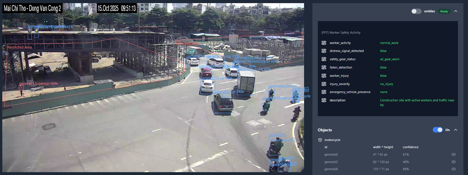 Với công nghệ Computer Vision sử dụng khả năng phát hiện đối tượng (object detection), giúp AI “nhìn thấy” và nhận diện các loại đối tượng như phương tiện, máy móc, công nhân, vật cản…. Obejct detection giúp hệ thống trả lời hai câu hỏi: Trong hình ảnh có những gì? Những đối tượng đó đang ở đâu? Từ đó dán nhãn các đối tượng để người dùng dễ dàng theo dõi và quản lý.