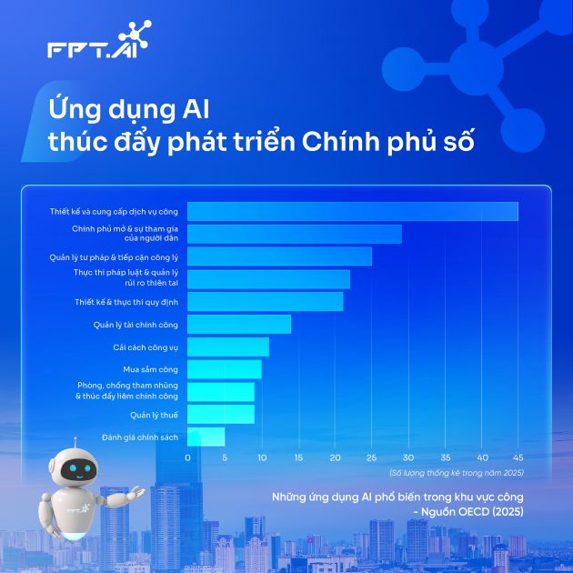 Các cơ quan chính phủ sở hữu nhiều bộ dữ liệu phong phú, bao gồm dữ liệu có cấu trúc và không có cấu trúc – và việc ứng dụng AI có thể giúp khai phá thêm nhiều insight giá trị. Theo báo cáo của OECD, dịch vụ công và chính phủ mở được xem là hai lĩnh vực có sự ứng dụng AI mạnh mẽ nhất. Đây cũng là những tác vụ có sự tương tác lớn với người dân,vậy nên sự hỗ trợ của AI giúp chính phủ cung cấp dịch vụ hiệu quả hơn, tăng trải nghiệm tương tác và mức độ hài lòng của người dân với chính phủ.