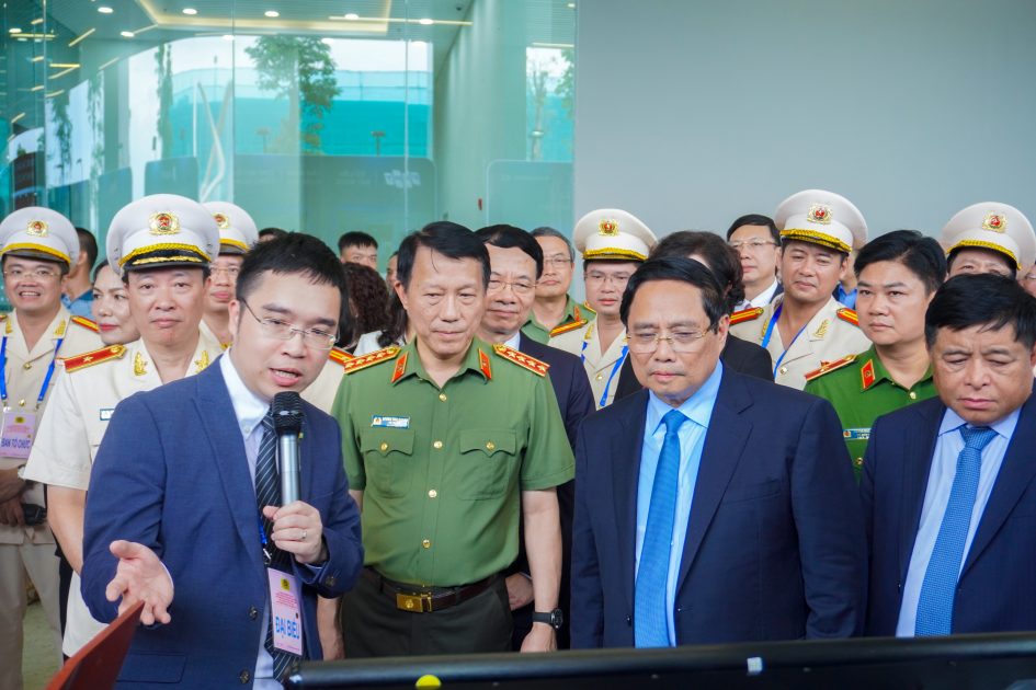Đại diện Tập đoàn FPT giới thiệu với Thủ tướng Phạm Minh Chính và đoàn lãnh đạo sản phẩm công nghệ tập trung giải quyết bài toán dữ liệu.