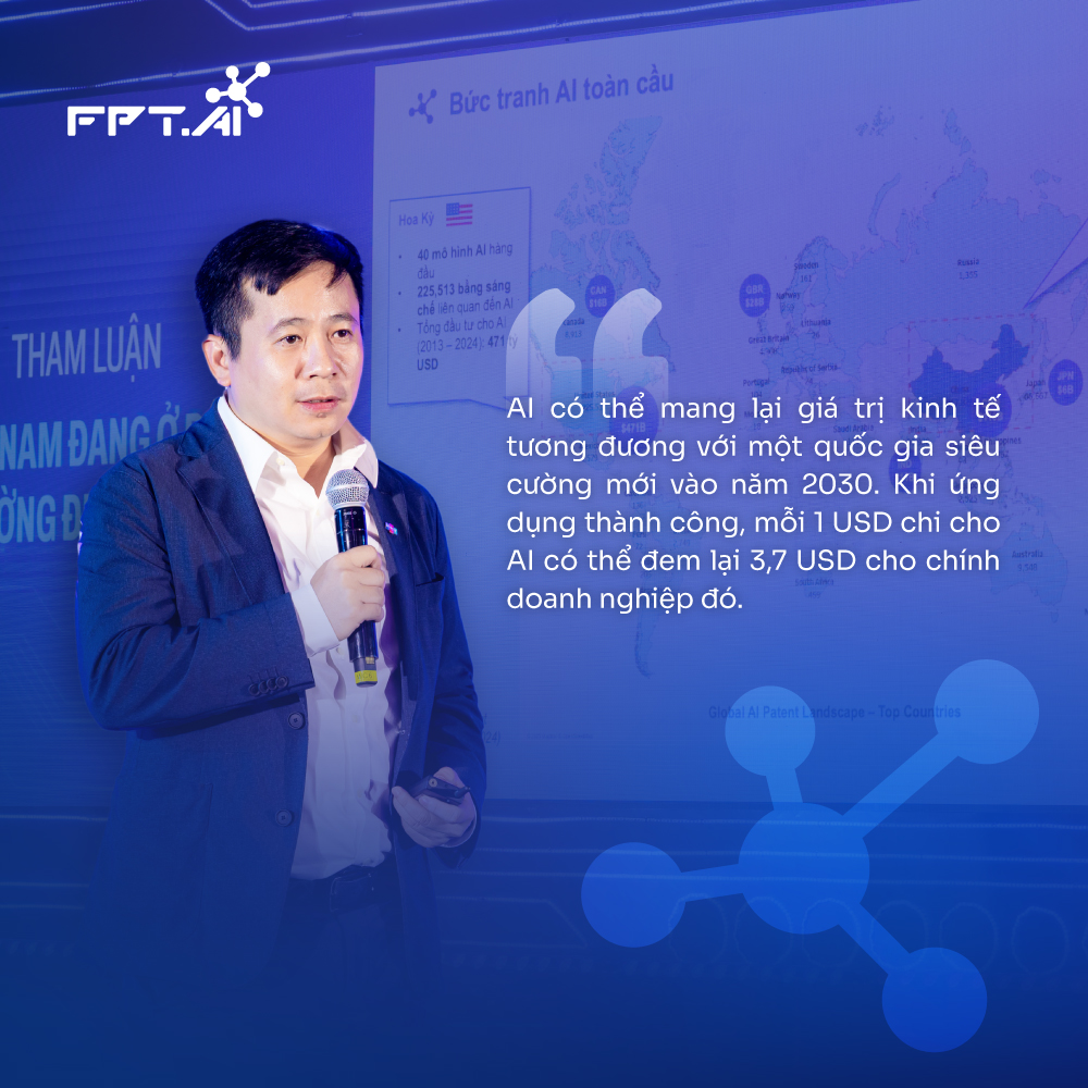Ông Lê Hồng Việt, Tổng Giám đốc FPT Smart Cloud, chia sẻ tại sự kiện: “AI có thể mang lại giá trị kinh tế tương đương với một quốc gia siêu cường mới vào năm 2030. Khi ứng dụng thành công, mỗi 1 USD đầu tư vào AI có thể đem lại 3,7 USD giá trị cho doanh nghiệp. Trong tương lai, mỗi công việc của chúng ta sẽ có một đồng nghiệp số đồng hành, giúp nhân loại đạt năng suất chưa từng có.”